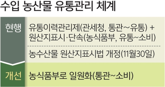 이에 관세청과 농식품부는 수입농산물 관리 체계를 일원화하고 관리 효율을 높이기 위해 유통 이력 관리 업무를 관세청에서 농식품부로 이관하기로 협의했다.